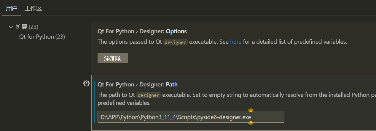 安装插件:Qt for Python,扩展设置Path路径添加designer的安装位置,这里以我的个人笔记本为例:D:\APP\Python\Python3_11_4\Scripts\pyside6-designer.exe,安装路径不清楚的话可以使用Everything进行全局搜索,输入:pyside6-designer.exe即可。
