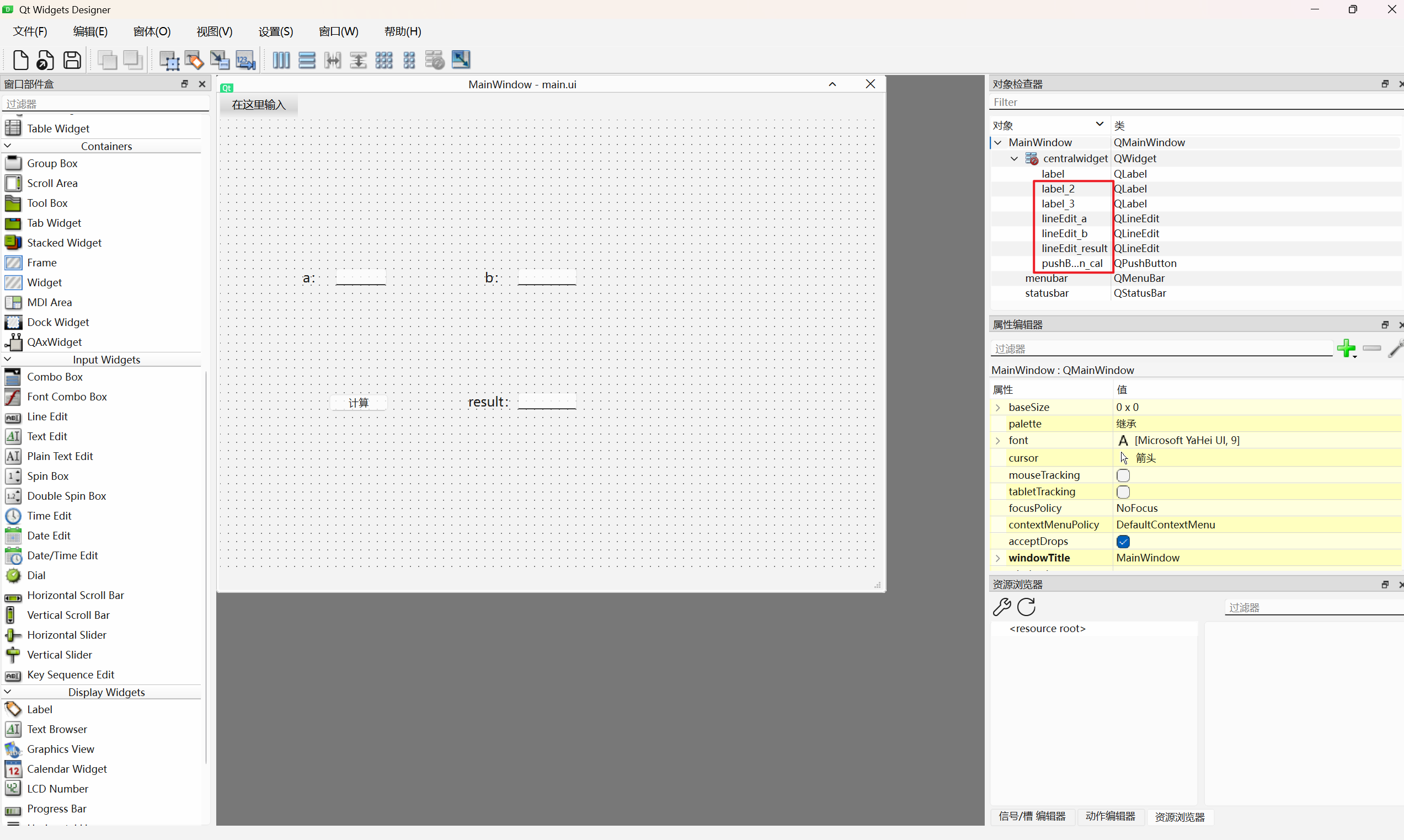 以最简单的加法计算器为例,在UI界面上添加一个按钮(Push Button)和三个Line Edit,分别代表计算按钮、参数a、参数b和计算结果c,建议养成一个好习惯:控件命名,方便在逻辑代码中进行调用。