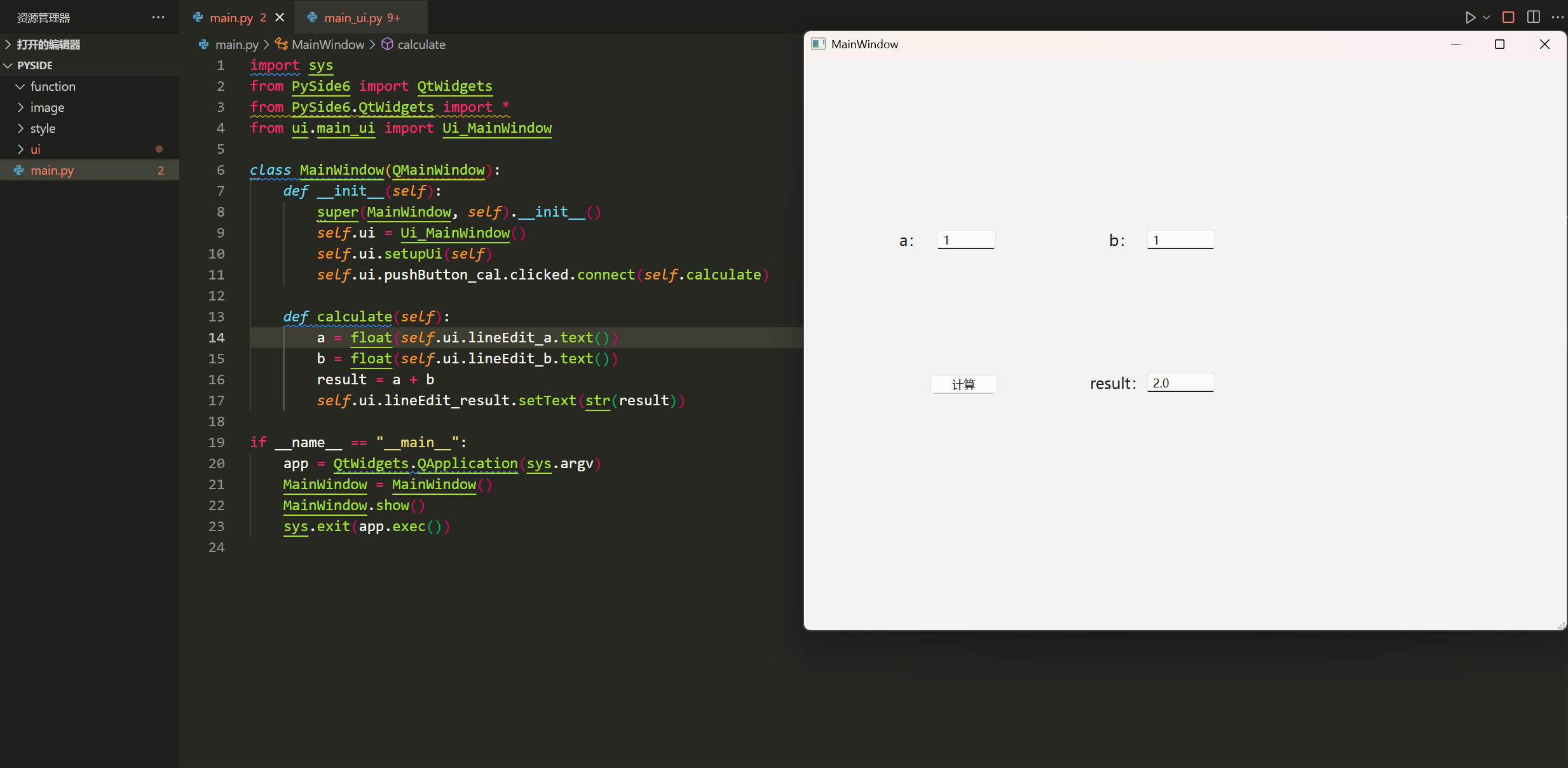 含有控件的代码成为界面代码,实现控件动作的代码称为逻辑代码,在每次保存ui文件时,界面代码都会刷新,所以不建议在界面代码中人为添加代码,可将两者进行分离,每次修改只需要在逻辑代码中修改即可。
