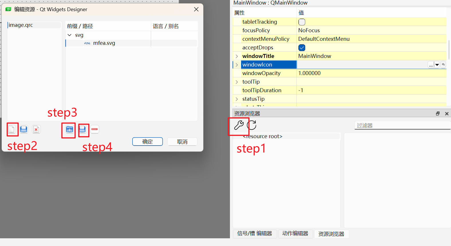 需要引入资源文件的概念,在qt中图片和图标都称为资源文件,文件后缀为.qrc